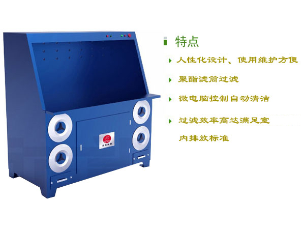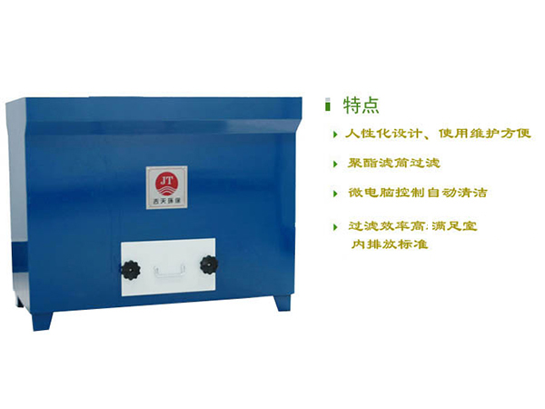 人性化设计、使用维护方便;聚脂滤筒过滤;微电脑控制自动清洁;过滤效率高达,满足室内排放标准;风机与过滤成一体,结构紧凑。
