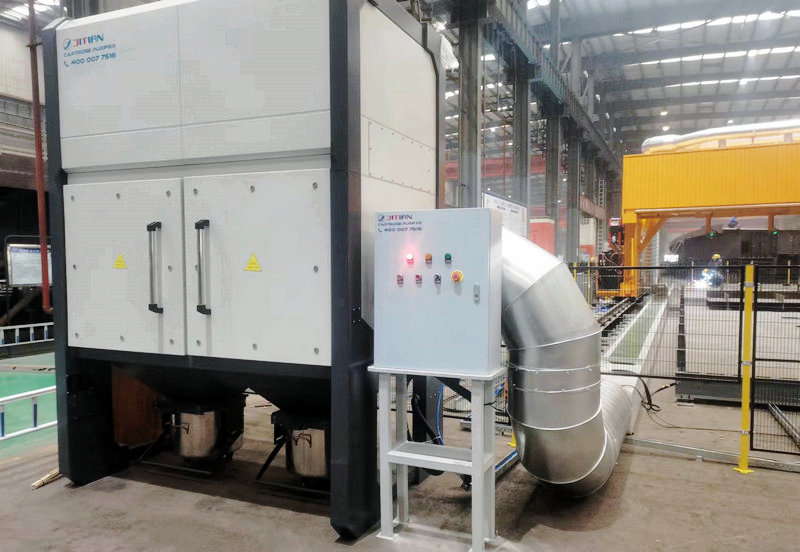 由顶吸罩捕捉烟尘,经连接管道进入吸风小车,再经吸风道和连接管道将含尘气体经滤筒集尘器净化后室内达标排放。应用设备: