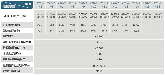 ◆ 低压长袋脉冲袋式除尘器LCDM220系列性能规格 ◆