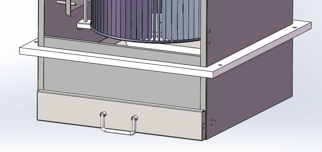 除尘净化器储灰箱,采用外置式机构,无需打开检修门,即可实现清灰,储灰箱沉降到工作间内部,无需攀爬到工作间顶部清灰,故可以实现室内清灰,因而简单,快捷。