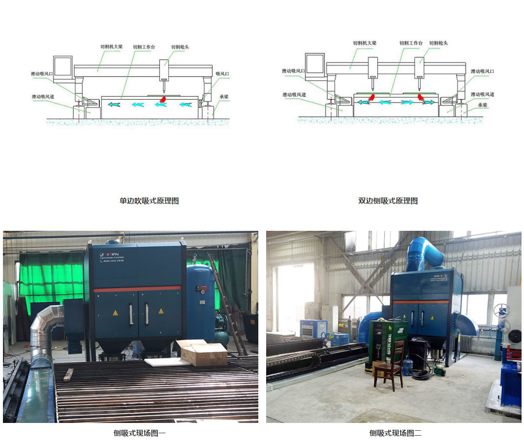 侧吸式烟尘净化系统采用吸风口固定在切割机龙门架上,吸风口与吸风道之间通过密封皮带密封,吸风口可随龙门架在吸风道上来回移动吸风,将切割的粉尘吸除。
