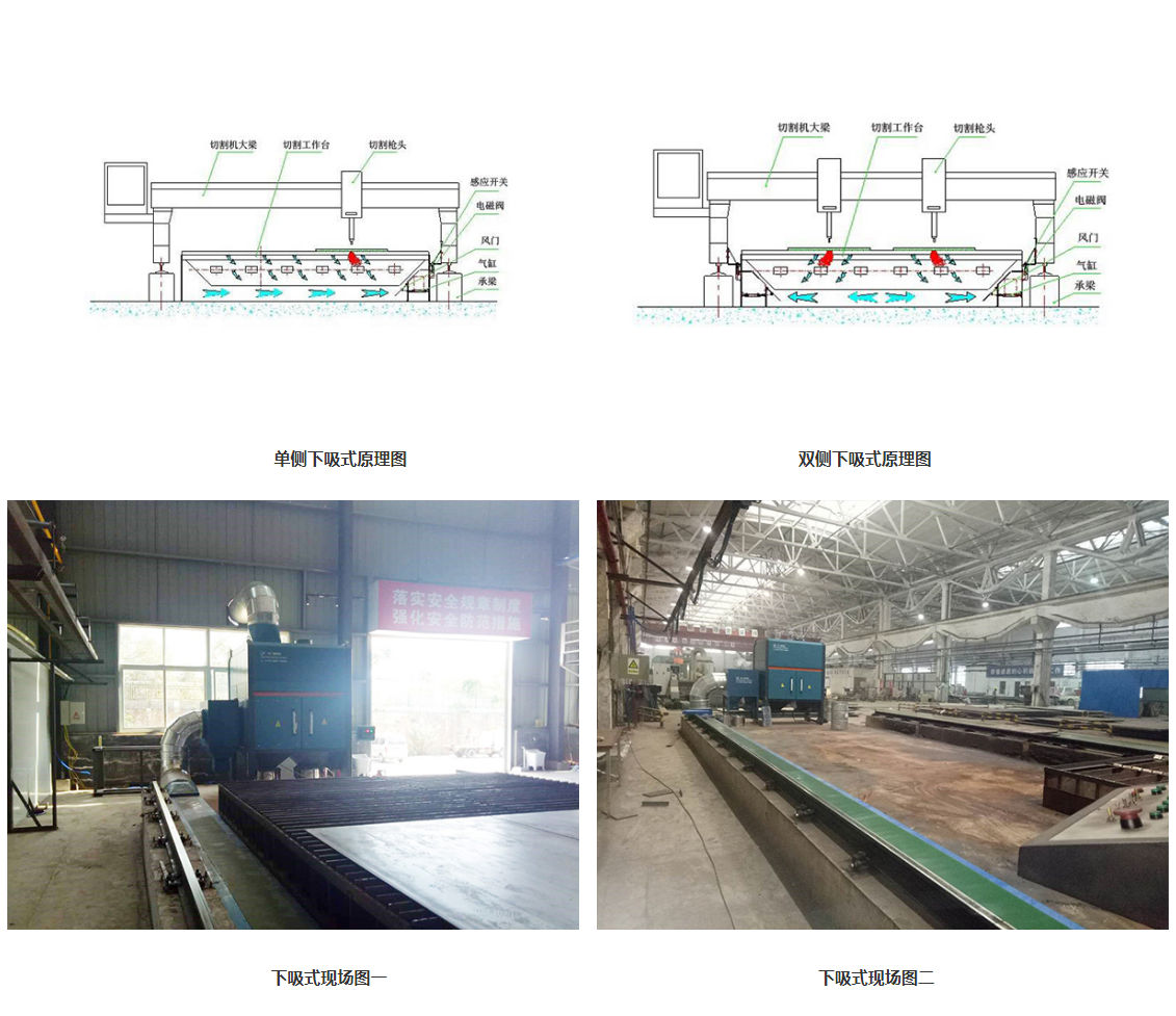 下吸式烟尘净化系统抽风是通过下吸式抽风切割台来实现的,下吸式抽风切割台分成若干个区域,每个区域设计有风门吸风,切割枪头在每个区域切割时,相应区域的风门打开抽风,将切割机的粉尘吸除。