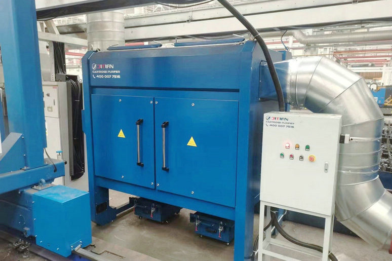 该项目激光切割机轨距宽6米,有效切割切割长度22米,集尘器选用我公司的JTLJ-B12DG一台,风机电机功率15KW,风量12000m³/h。