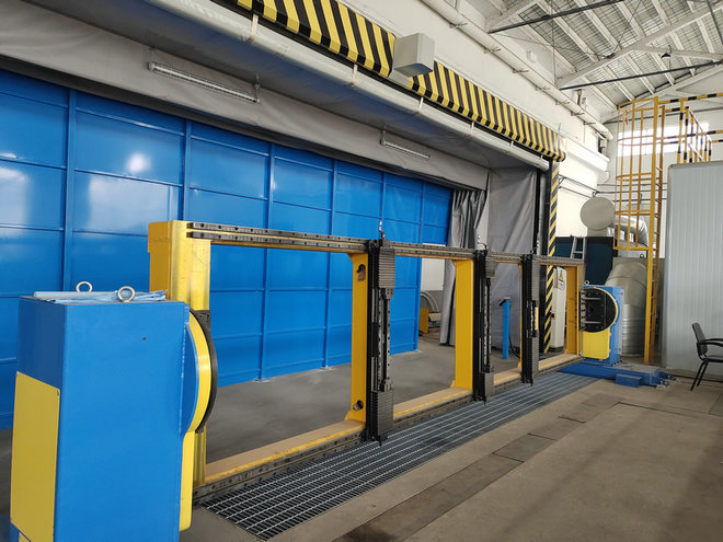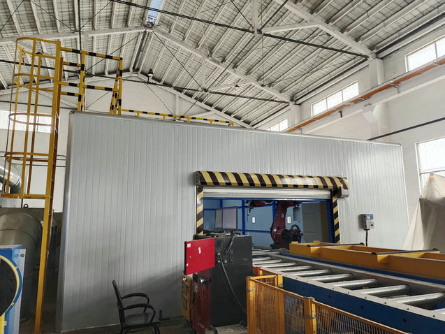 车间2个机器人打磨工作站,一个工作站为自动物料输送线,一个站工件需要行车吊运,打磨时产生扬尘和飞溅,需要除尘处理。解决方案