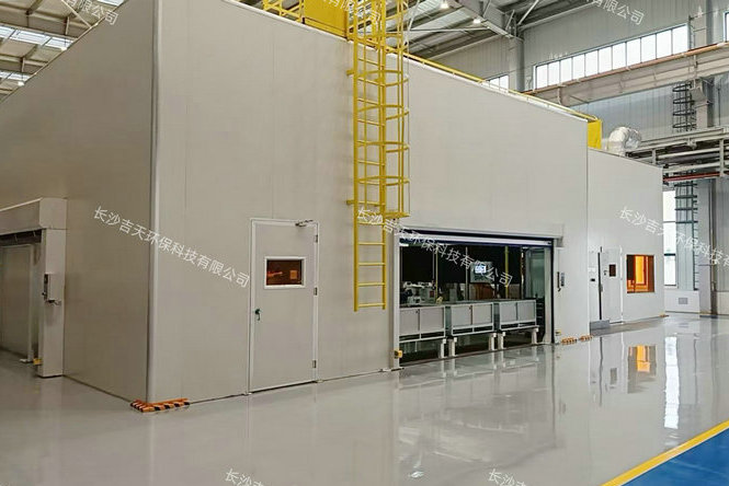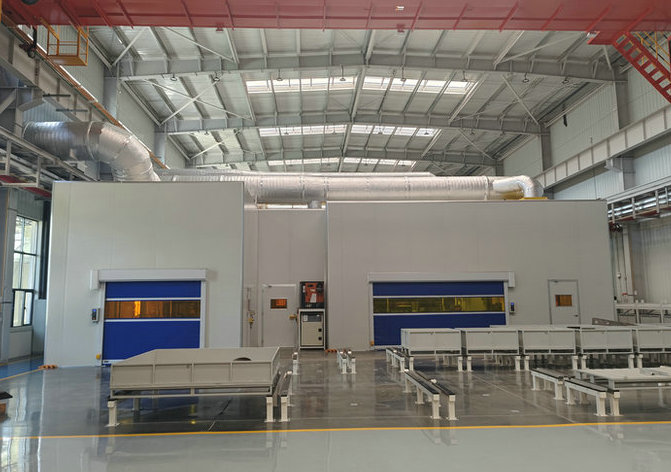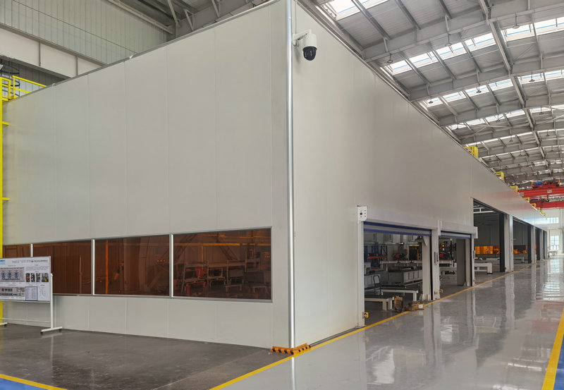 数字化焊接车间:小件焊接工作间三个(有通道联接),大型装配件焊接工作间一个,激光焊接工作间一个,补焊工作间一个。焊接工作间特别大(最大的长66m*宽10m*高5.6m),工件特别大,工件从工作间的侧面进出,侧面最大物流门宽度达17m,工作间顶部开设天窗,便于车间大行车起吊,内部有KBK吊车,工作间全封闭,焊接工作间结构复杂。工件材质有铝合金,对温湿度有要求:控温(夏季≤28℃、冬季≥10℃);控湿(湿度≤65%);除尘(烟尘浓度≤4mg/m3)。