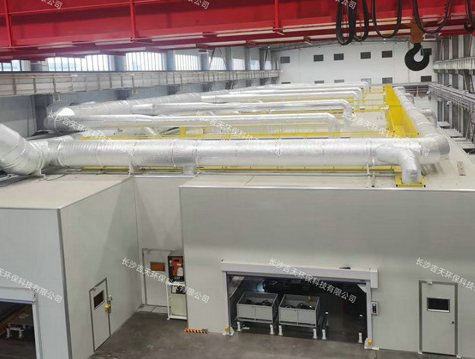 针对本项目要求:采用二套组合式空气处理机组+空调制冷机,气流组织为“下送上回”的整体置换通风方式,即工作间两侧下部离地2.0米高安装专用送风筒送风,工作间顶部安装百叶窗回风。通过送风管道和回风管道与组合式空气处理机组联接成一个整体。室外排风管排放口高度20米。该项目安装后验收合格:治理后室内、室外均达到职业健康、 环保排放指标。设备说明: