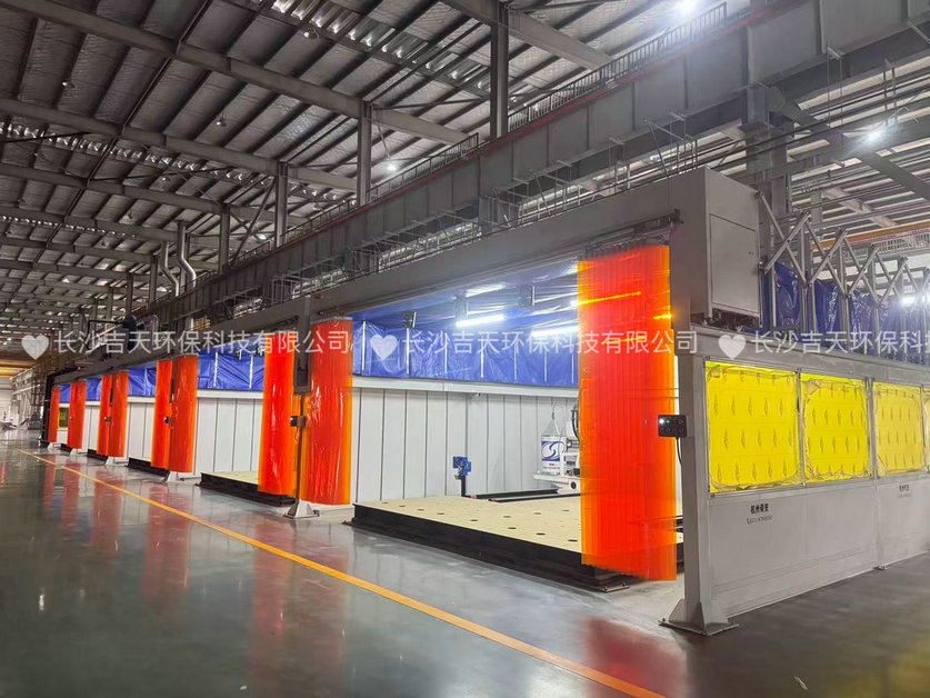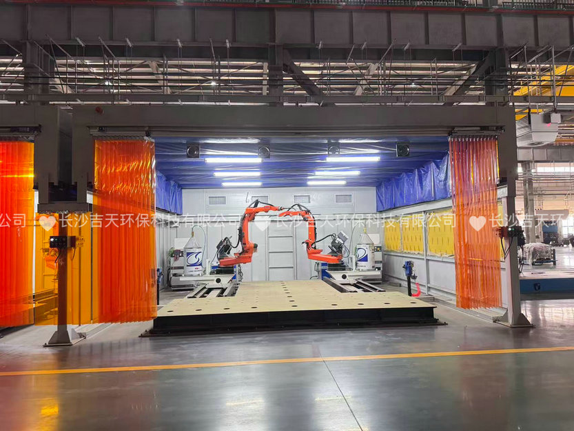 采用烟尘采集方式架高伸缩式工作房,方便行车吊运工件,伸缩房架高部分为钢结构+碳钢喷塑封板+亚克力封板,房体后侧上方抽风。每2个机器人焊接工作站共用一套除尘系统。
